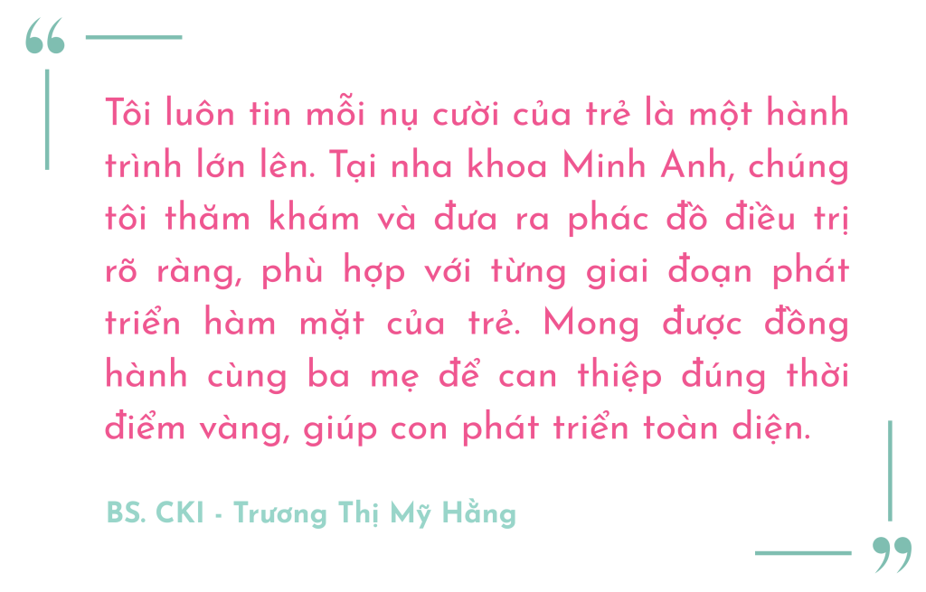 Con tôi có khớp cắn ngược khá nặng, rất khó ăn nhai. Tôi đã cho con đi thăm khám với Bs Hằng lúc con 13 tuổi và may mắn được biết đây là giai đoạn vàng để điều trị. Việc điều trị của con được chia thành 2 giai đoạn và kết thúc vỏn vẹn trong vòng 20 tháng. Nhưng nếu để thêm vài năm, việc này có thể sẽ không chỉ trong 20 tháng và còn có thể khó thực hiện. Rất khuyến khích ba mẹ đưa con đi thăm khám sớm nhé.